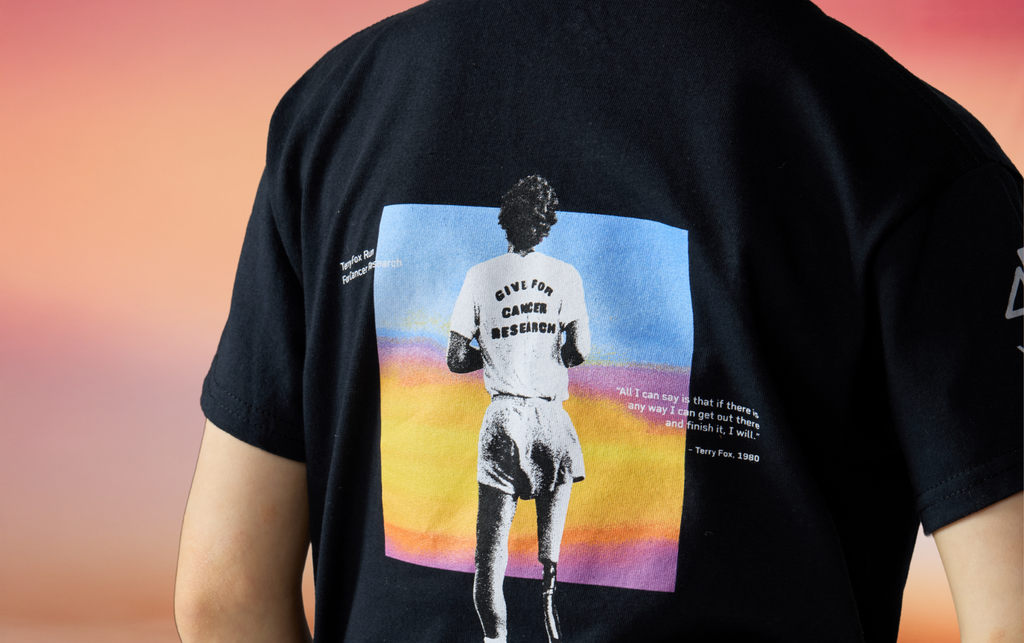 Au dos du chandail, on aperçoit l'image de Terry de dos en train de courir en menant des millions de personnes à travers le Canada et au monde à poursuivre son combat contre le cancer.
